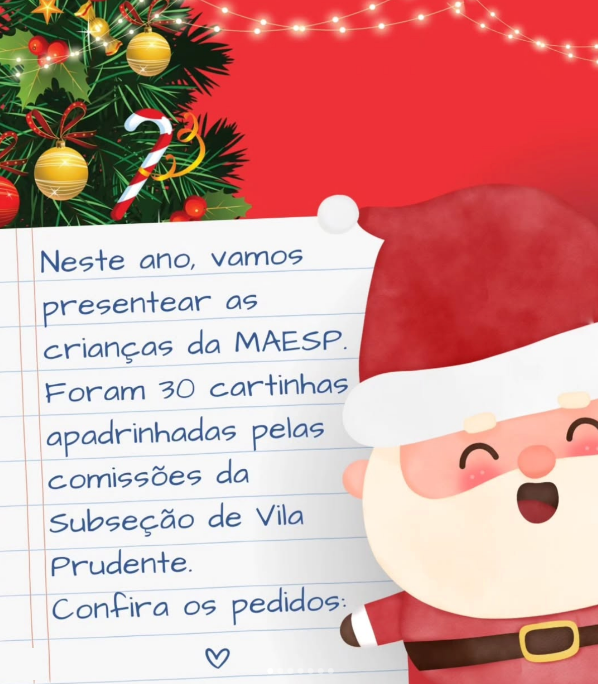 Este ano a Comissão de Ação Social e Cidadania da nossa Subseção vai apadrinhar as cartinhas de Natal das crianças da MAESP.