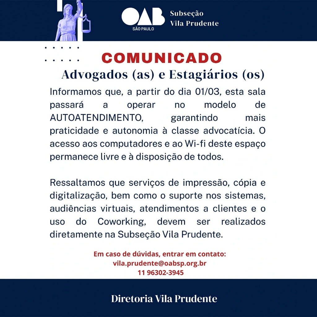 Ressaltamos que serviços de impressão, cópia e digitalização, bem como o suporte nos sistemas, audiências virtuais, atendimentos a clientes e o uso do Coworking, devem ser realizados diretamente na Subseção Vila Prudente.