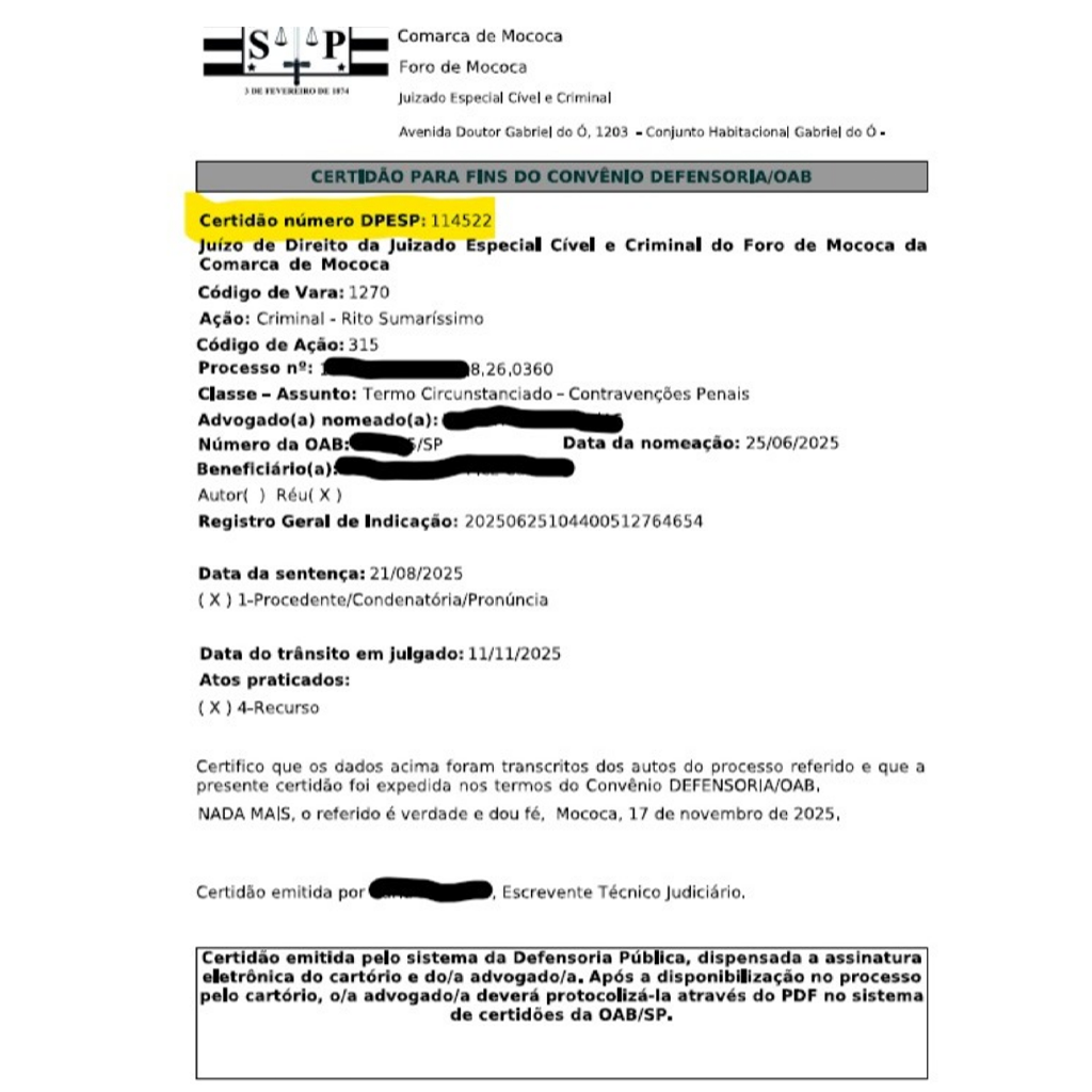 A partir de 03/02/2026 no cadastramento da certidão de honorários será necessário informar o Numero DPESP da Certidão (que fica na parte de cima das certidão), conforme modelo acima.